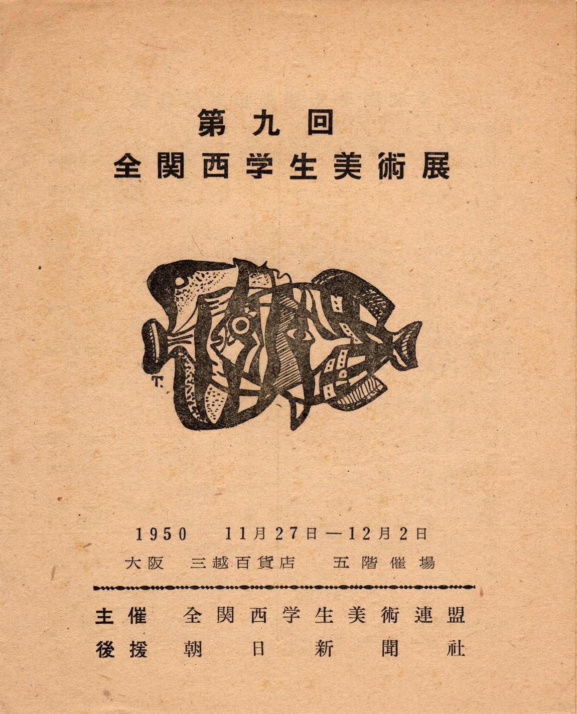 1950(昭和 25)年には、関西の大学美術部で組織された全関西学生美術連盟が主催、朝日新聞社が後援する全関西学生美術展(全関展)に初めて参加する。